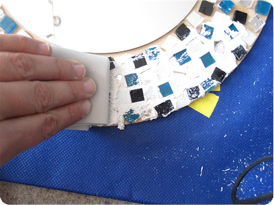 Now that your glue has dried you can apply some grout to your work. Its fairly easy to start out. Just slap it on and spread it around with a squeegee. (again i cheated and used a folded piece of foam.)