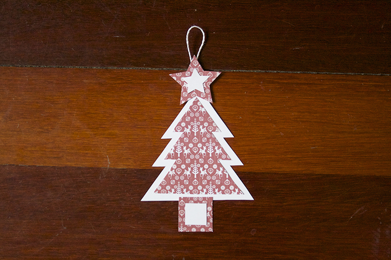 Stick the layering pieces together with double sided tape. Once you have each of the layered pieces assembled stick the star to the top and the square to the base of the tree.